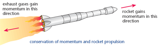 The rocket also moves with the principle of law of conservation of momentum because when it burns the fuel and exhaust the gases it actually releases the mass from the bottom tip of it and hence gets an upward thrust to conserve the momentum.