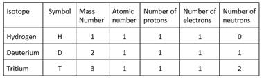 The three subatomic particles, electrons, protons and neutrons, in the three isotopes of hydrogen are given in the following table: