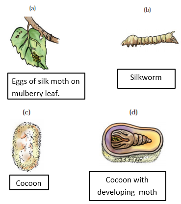 (d) Cocoon with developing moth: Moth starts developing inside cocoon. When cocoon is boiled/ exposed to steam to separate silk fibres, the moths present inside are killed.