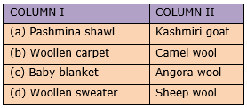 A wholesale woollen fibre dealer gets the woollen fibre of different textures sorted for various purposes. Match the items in Column I with the woollen fibre in Column II.