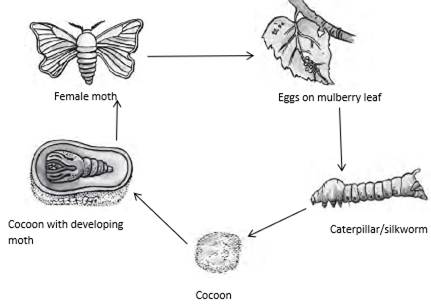 (1) Firstly the female silk moth lays eggs from which larvae come out.