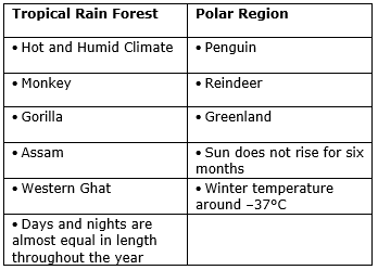 Penguin, Gorrila, Monkey, Reindeer, Assam, Greenland, Sun does not rise for six months, Hot and humid climate, Days and nights are almost equal in length throughout the year, Winter temperature around –37°C, Western Ghats