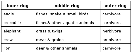 of food they eat and the category to which they belong (based on the eating habit) in the outermost ring. One example has worked out for you. Green and blue colours for writing.
