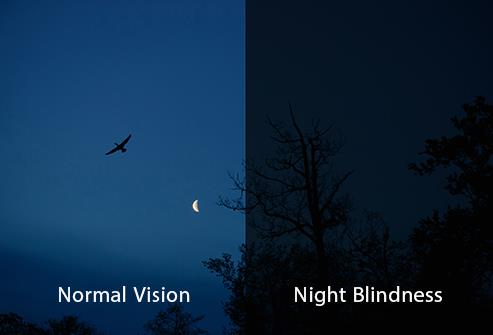 In night blindness, a person is not able to see properly in low light. In night, the person cannot see anything, as shown in the picture below:
