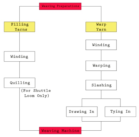 In weaving process, the two sets of yarns are woven at a right angle to make fabric. The weaving of fabric is done on looms. The looms are either hand operated or power operated.