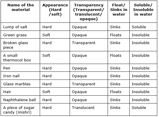 During summer holidays, a group of children collected a lump of salt, green grass, broken glass piece, a small thermal box pen, iron nail, glass marbles, hair, naphthalene ball, a piece of sugar candy(mishri) and tried to group them on the basis of properties given in Table 4.1 below. Help them in filling the Table.