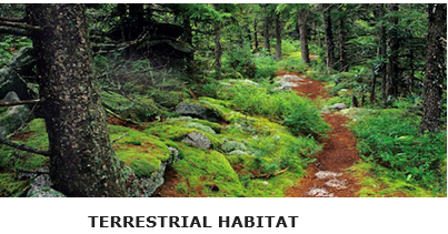 Terrestrial habitats are ones that are found on land, like forests, grasslands, deserts, shorelines, and wetlands. An aquatic habitat is a habitat with water. It includes areas that are permanently covered by water and surrounding areas that are occasionally covered by water.
