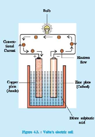 As shown in figure, take solution of dilute sulphuric acid (H2SO4) in a beaker. Dip one copper plate and another zinc plate in the solution in such a way that they do not touch each other. These two plates get electrically charged due to the process between these two plates and the solution. The positive charge at copper plate and negative charge at zinc plate get deposited. Thus, electric potential difference is produced between two plates. Positive charge plate is called positive pole of battery or anode and the negatively charged plate is called negative pole of battery or cathode.