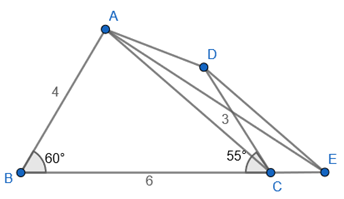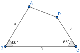 I draw a quadrilateral ABCD of which BC = 6 cm, AB = 4 cm, CD = 3 cm, ABC = 60°, BCD = 55°, I draw a triangle with equal area of that quadrilateral of which one side is along side AB and other side is along side BC.