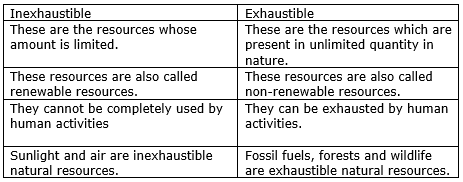 What do you understand by exhaustible and inexhaustible natural resources? Name two exhaustible and inexhaustible natural resources.