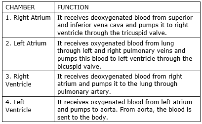 Name four chambers of human heart. State one function of each chamber in a tabular form.