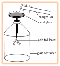 Construction: An electroscope has a brass rod passing through a tight fitting cork in a glass bottle. A pair of thin gold leaves is attached to the lower end of the brass rod. To protect the gold leaves from an external electric charge the lower half of the bottle is lined with tin foil which is ‘earthed’ by connecting it to the table.