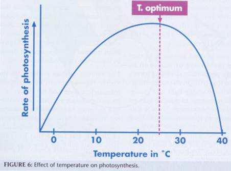 The rate of photosynthesis increases with the increase in temperature, only upto a certain limit. For every 100 rise, the rate is almost doubled. The plants show maximum photosynthesis at optimum temperature. It is between 20-30o C. Further increase in temperature leads to decrease in the rate of photosynthesis as the enzymes get denatured at high temperature and do not work efficiently.