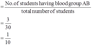 In Q.1, Exercise 14.2, you were asked to prepare a frequency distribution table regarding the blood groups of 30 students of a class. Use this table to determine the probability that a student of this class, selected at random, has blood group AB