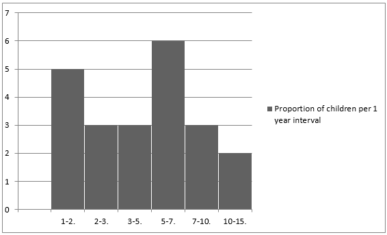 Taking the age of the children on x-axis and proportion of children per 1 year interval on y-axis, the following histogram can be drawn:
