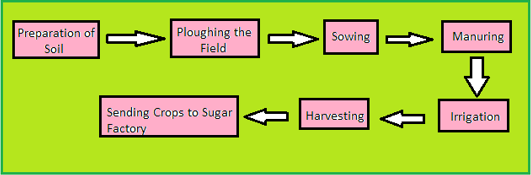 Arrange the following boxes in proper order to make a flow chart of sugarcane crop production.
