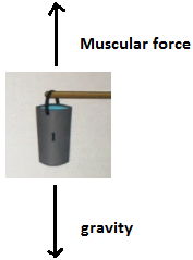In this case, muscular force is acting in an upward direction and the force of gravity is acting in a downward direction.