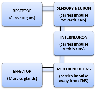 So the process goes as Stimulus Receptor organ Sensory nerve Spinal cord (interneurons will act) Effecter neurons Effecter organs Response
