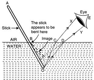 In the given diagram, the portion BO of straight stick is immersed in water, but it appears to be bent at point B. The ray OC and OD coming from lower end of stick gets refracted away from normal in direction CX and CY. These rays when produced backwards appear to meet at ‘I’ so the virtual image BI is visible to us.