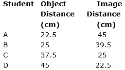 Four students A, B, C and D were asked by their teacher to find the corresponding image distance for the given object distance keeping the object at various distance in case of a given convex lens of focal length 15 cm. The following observation were recorded by them.