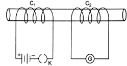 Two coils C1 and C2 are wrapped around a non conducting cylinder. Coil C1 is connected to a battery and key and C2 with galvanometer G. On pressing the key (K), current starts flowing in the coil C1. State your observation in the galvanometer: