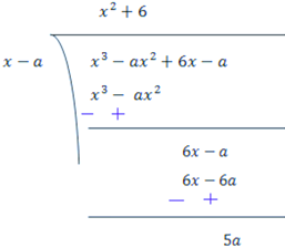 Therefore, remainder obtained is 5a when x3 – ax2 + 6x – a is divided by x – a