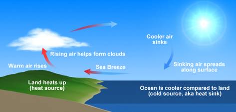 The air above the sea is cooler, and a high pressure prevails above the sea. Cool air from the sea moves towards the land to occupy the space created in the land. This cool air is called a sea breeze, and it blows in the afternoon.