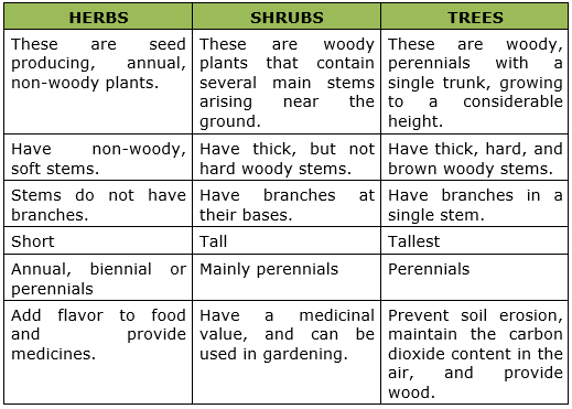 Herbs, shrubs, and trees are three types of plants categorized based on the size and the branching pattern of each plant. The main difference between herbs, shrubs and trees is that herbs have soft, non-lignified, un-branched stems while shrubs have woody, immediately branched, multi stems and trees have woody stems that grow upright for about a meter before branching. Since shrubs and trees are somewhat similar to each other, they are always lumped together. Banana, basil, tulsi, lettuce, and coriander are examples of herbs. Shrubs are taller than herbs. Rose and lemon are examples of shrubs. Trees are the tallest plants. Mango, coconut, and Banyan are examples of trees.