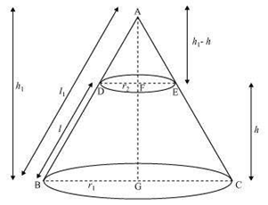 Let ABC be a cone. A frustum DECB is cut by a plane parallel to its base. Let r1 and r2 be the radii of the ends of the frustum of the cone and h be the height of the frustum of the cone