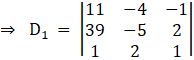 ⇒ D1 = 11[( – 5)(1) – (2)(2)] + 4[(39)(1) – (2)(1)] – 1[2(39) – ( – 5)(1)]