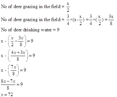 Half of a herd of deer are grazing in the field and three fourths of the remaining are playing nearby. The rest 9 are drinking water from the pond. Find the number of deer in the herd.