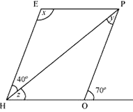 The adjacent figure HOPE is a parallelogram. Find the angle measures x, y and z. State the properties you use to find them