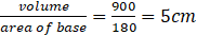 Find the height of a cuboid whose base area is 180 cm2 and volume is 900 cm3?