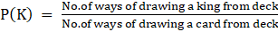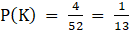 ⇒ P(K) = P(Drawing King from 52 cards deck)