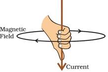 A convenient way of finding the direction of magnetic field associated with a current-carrying conductor is given in the diagram. Imagine that you are holding a current-carrying straight conductor in your right hand such that the thumb points towards the direction of current. Then your fingers will wrap around the conductor in the direction of the field lines of the magnetic field, as shown in the diagram. This is known as the right-hand thumb rule.