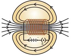wrapped closely in the shape of a cylinder is called a solenoid. The pattern of the magnetic field lines around a current-carrying solenoid is shown in the diagram. One end of the solenoid behaves as a magnetic north pole, while the other behaves as the south pole. The field lines inside the solenoid are in the form of parallel straight lines. This indicates that the magnetic field is the same at all points inside the solenoid. That is, the field is uniform inside the solenoid.