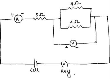 Draw a circuit diagram of an electric circuit containing a cell, a key, an ammeter, a resistor of 2Ω in series with a combination of two resistors (4Ωeach) in parallel and a voltmeter across the parallel combination. Will the potential difference across the 2Ωresistor be same as that across the parallel combination of 4Ω resistors? Give reason.