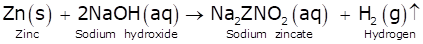 2. On reacting with zinc metal, NaOH forms sodium zincate, and hydrogen gas is liberated. The hydrogen gas burns with a pop sound.