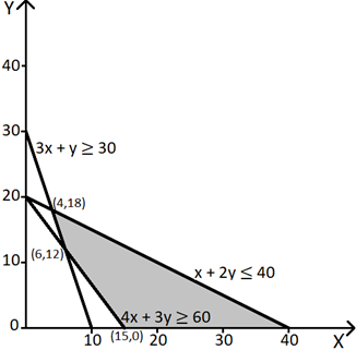 x + 2y≤ 40,3x + y ≥ 30, 4x + 3y≥ 60, x ≥ 0, y ≥ 0
