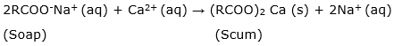 The scum is a white soild waste formed when soap is reacted with hard water. The reaction is given below: