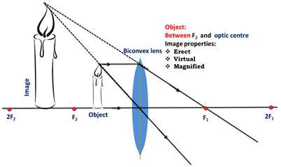 The size of the image increases gradually when it is brought close to the optical center. Example, when a candle is placed between focus “F” and optical centre “O”, then a very enlarged image is formed as shown below: