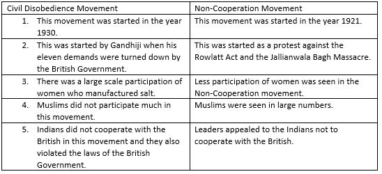 Non-Cooperation movement and Civil Disobedience movements were started by Mahatma Gandhiji. The following are the differences between Civil Disobedience and the Non-Cooperation movement.