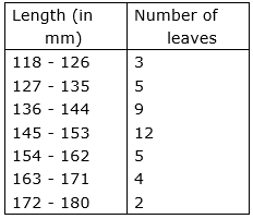 The length of 40 leaves of a plant is measured correct to one millimeter, and the obtained data is represented in the following table: